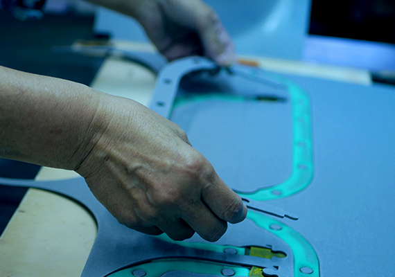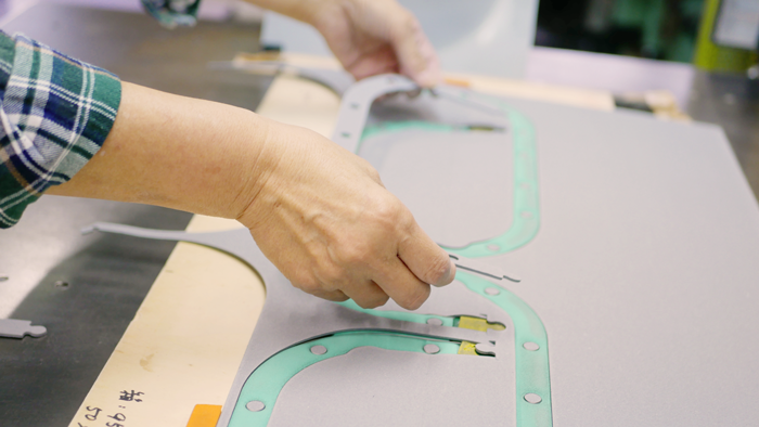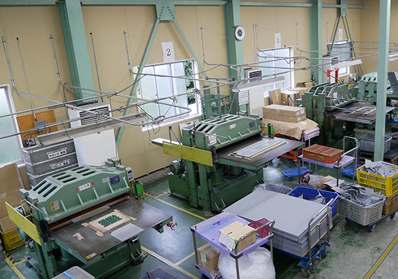 秋山製作所は、ゴムや繊維素材の平板素材に、トムソン型とよばれる型をプレスすることで、